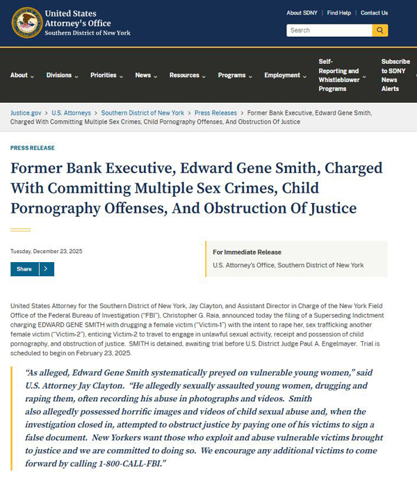 【美新社讯】近日,美国司法部(DOJ)发布公告披露:前银行高管爱德华·吉恩·史密斯(EDWARD GENE SMITH)被控犯有多项性犯罪、儿童色情罪和妨碍司法公正罪。
