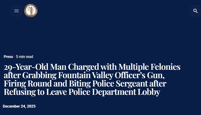 【美新社讯】12月24日,橙郡地区检察长办公室(OC County DA)发布公告:一名正在缓刑期间的29岁的男子,上周因拒绝服从多次命令离开喷泉谷警察局大厅,在警方试图逮捕他时,抢夺了一名喷泉谷警官的枪支,开了一枪,并咬伤了一名警官,目前已被控多项重罪。所幸枪击事件中无人受伤。