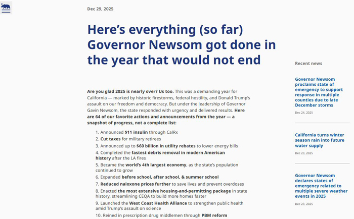 公告显示:“2025年即将结束?这是充满挑战的一年 -- 经历了历史性的火灾、联邦政府的敌意以及唐纳德·特朗普对加州自由和民主的攻击。但在州长纽森(Gavin Newsom)的领导下,加州迅速应对,并取得了显著成果。以下是精选的 64 项年度行动和公告 -- 这只是进展的缩影,并非完整清单。”