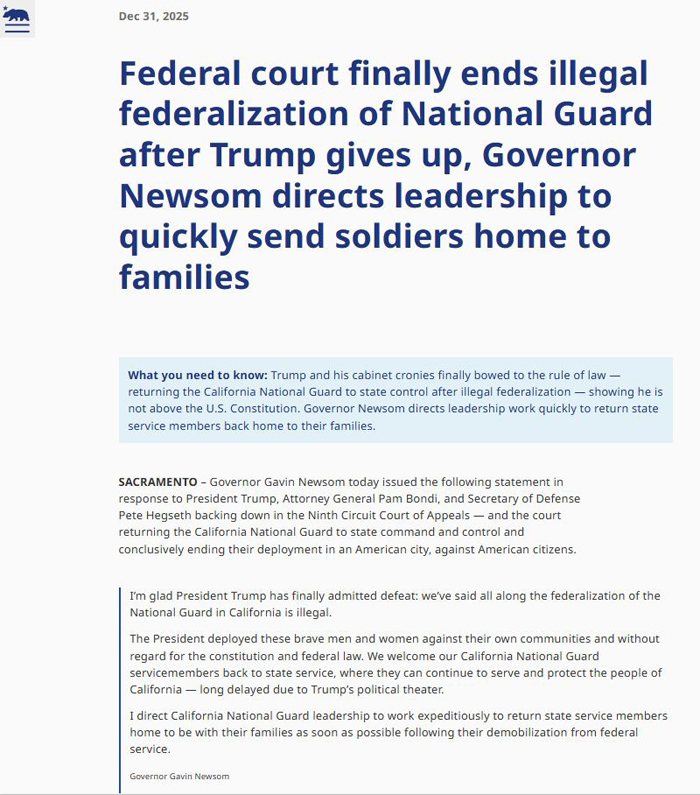 【美新社讯】2025年12月31日,加州州长纽森(Gavin Newsom)办公室发布公告:加州州长纽森回应特朗普总统、司法部长帕姆·邦迪和国防部长皮特·赫格塞特在第九巡回上诉法院的让步,以及法院将加州国民警卫队归还州政府指挥和控制,并最终结束他们在某个美国城市针对美国公民的部署。