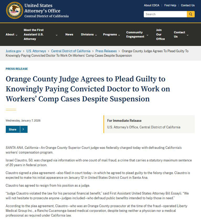 【美新社讯】近日,美国司法部(DOJ)公告披露:南加州橙郡高等法院的一名法官被联邦指控欺诈加州工伤赔偿计划。他承认明知故犯地聘请已被吊销执照的医生处理工伤赔偿案件。
