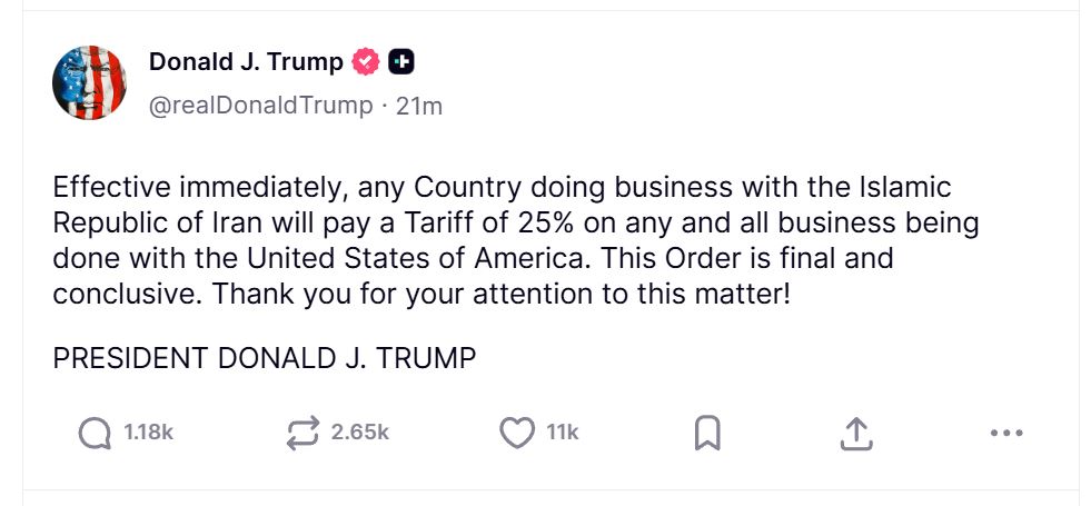 U.S. President Donald J. Trump announced on social media that any country conducting business with the Islamic Republic of Iran will face a 25% tariff on all trade conducted with the United States.