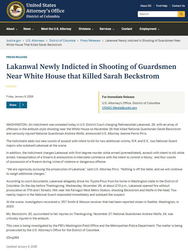 【美新社讯】2026年1月9日,司法部(DOJ)公告披露:在11月26日白宫附近发生的伏击式枪击事件中,导致国民警卫队队员莎拉·贝克斯特罗姆(Sarah Beckstrom)死亡,国民警卫队队员安德鲁·沃尔夫(Andrew Wolfe)受重伤的嫌疑人 -- 现年 29 岁的拉赫曼努拉·拉坎瓦尔(Rahmanullah Lakanwal)被正式起诉,并增加新指控。