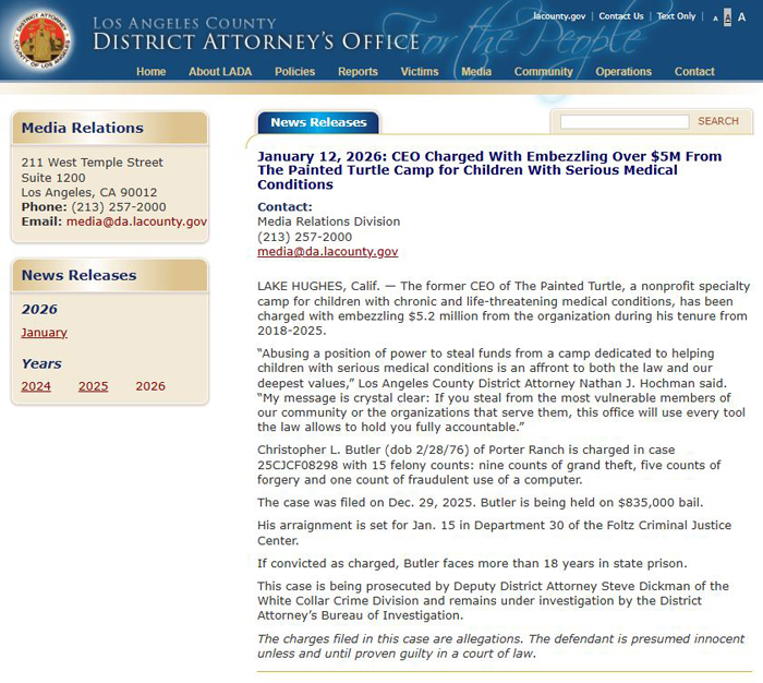 【美新社讯】1月12日,洛杉矶郡地区检察长霍赫曼(Nathan Hochman)办公室发布公告:一名前首席执行官被指控挪用逾500万美元,款项来自一家为患有严重疾病儿童设立的“彩龟营”(The Painted Turtle Camp)。