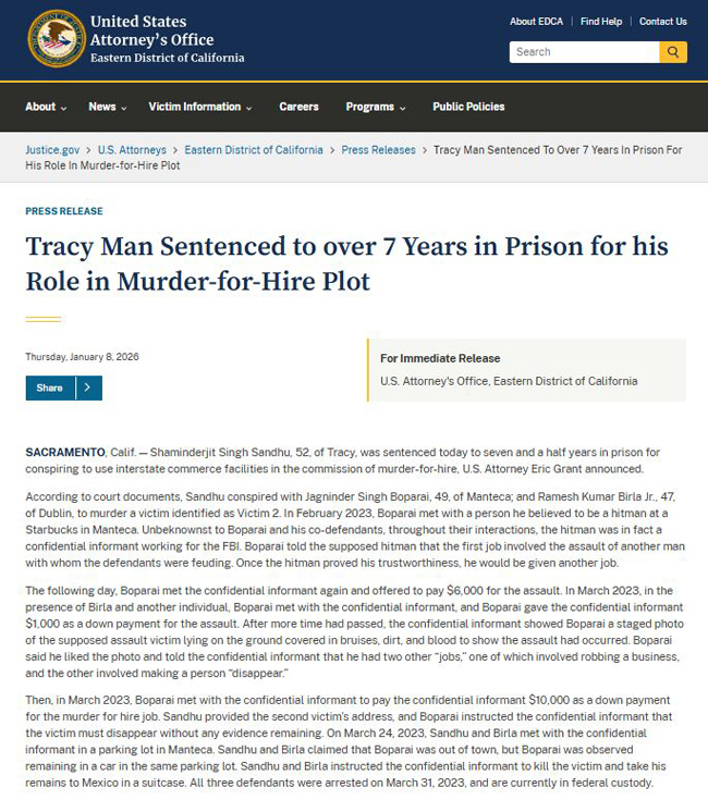 🚨 美国检察官埃里克·格兰特宣布,被告人 -- 52岁的特雷西居民 沙明德吉特·辛格·桑德胡(Shaminderjit Singh Sandhu)被判处七年半监禁,罪名是密谋利用州际商业设施实施雇凶杀人。
