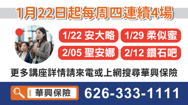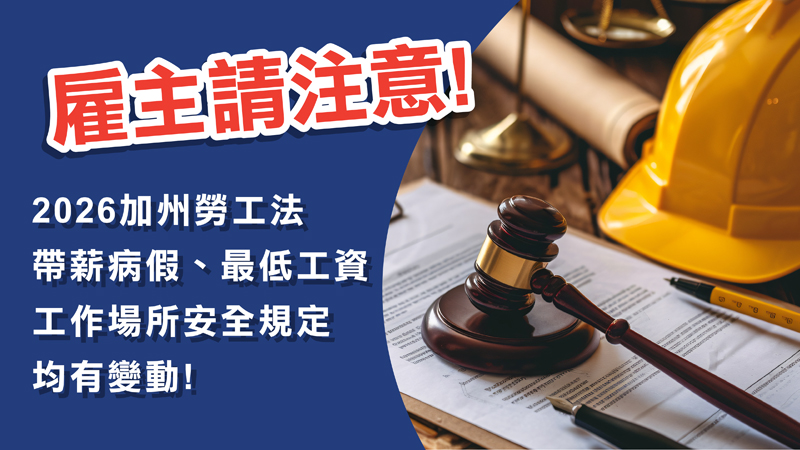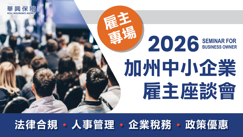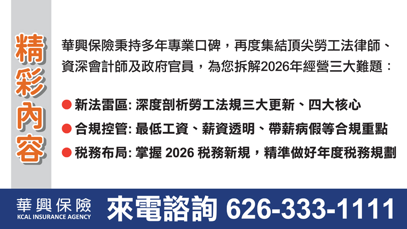 2026年新春開年,對於企業雇主來說,仍有諸多新勞工法規更動需注意,包括今年加州最低時薪漲至16.90美元、員工擔任陪審團當日可使用病假、明文規定嚴格禁止雇主侵吞小費等,華興保險將於1月22日連續在大洛杉磯地區舉辦四場勞工法稅法講座,呼籲企業雇主與高管出席吸收新知,避免觸法!