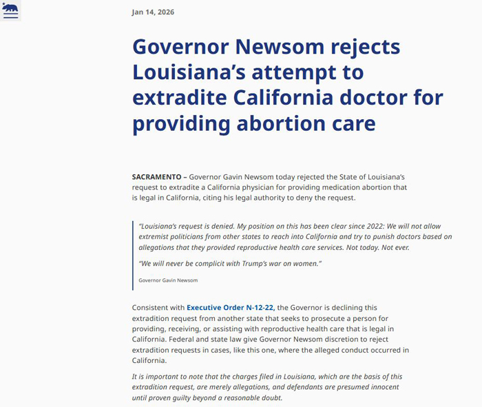 【美新社讯】2026年1月14日,加州州长纽森(Gavin Newsom)办公室发布公告:拒绝了路易斯安那州引渡一名提供药物堕胎服务的加州医生的请求,他援引其法律权力驳回了该请求。在加州,药物堕胎是合法的。