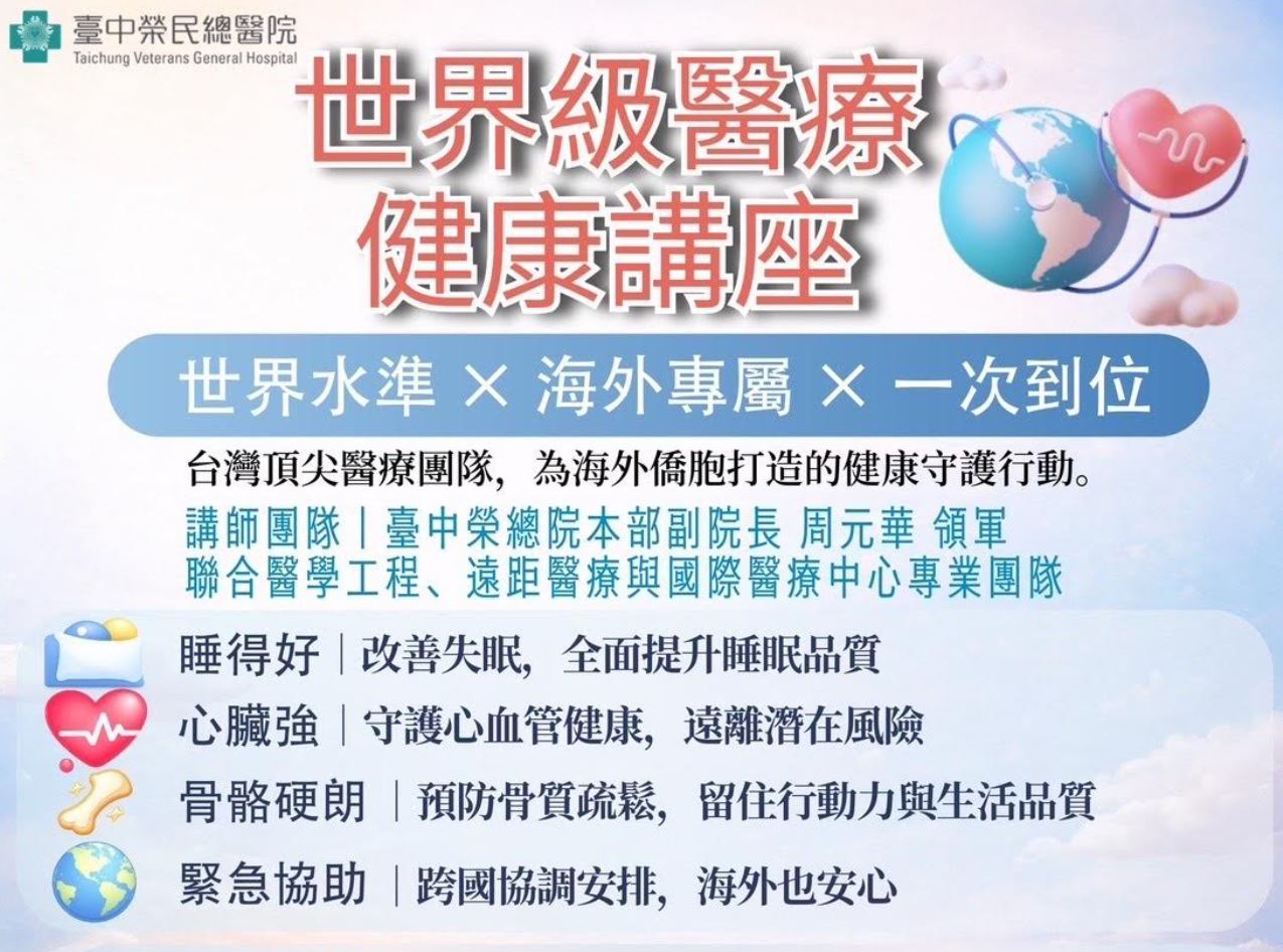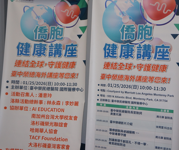 【美新社洛杉磯訊】為提升海外僑胞健康意識,提供與國際接軌的一站式醫療資訊,在僑務委員潘意玲牽頭和各社團及社區各界人士的支持下,『臺中榮民總醫院』將於 2026 年 1 月 25 日(星期日)上午 10 時至 11 時 30 分,和下午3時至4時30分,分別在 Courtyard by Marriott Los Angeles Monterey Park和 Embassy Suites by Hillton Santa Ana, Orange County Airport盛大舉辦「世界級醫療・健康講座」,結合世界水準醫療、海外專屬服務與一次到位的健康守護行動,並邀請南加州僑胞踴躍參與。