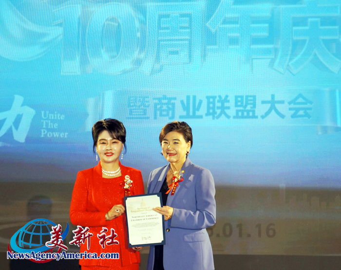 【美新社洛杉矶讯】1月16日晚间,主题为『聚力•领航』的美国东北总商会10周年庆典暨商业联盟晚宴,于洛杉矶圣盖博希尔顿酒店隆重举行。本次庆典晚宴可谓三喜临门,美国东北总商会创会会长路霞女士升格担任商会理事团主席,精英企业家朱京一接任会长。
