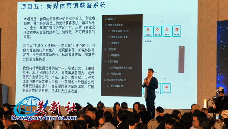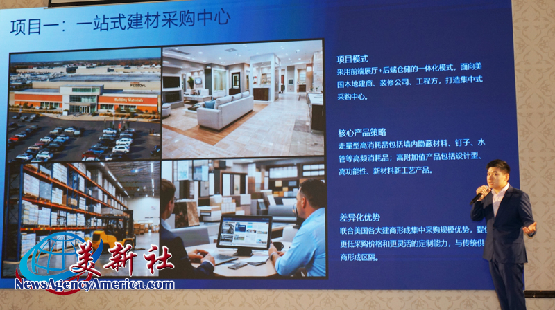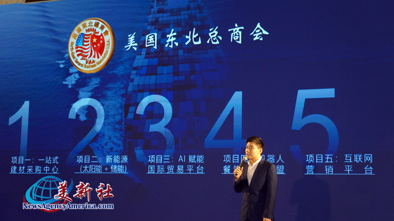 当晚,理事长潘劲东向来宾们介绍了美国东北总商会五大项目:一站式建材采购中心、新能源项目、AI 赋能的国际贸易平台、机器人餐饮连锁加盟、和新媒体运营获客系统。