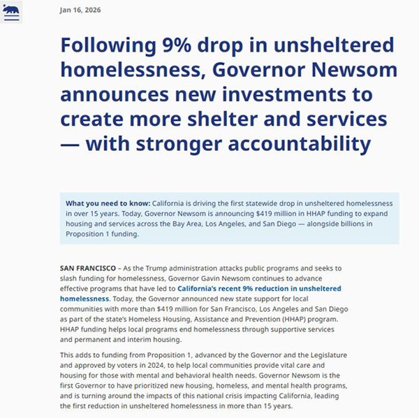 【美新社讯】1月16日,加州州长纽森(Gavin Newsom)办公室发布公告:在特朗普政府攻击公共项目并试图削减无家可归者援助资金之际,纽森州长继续推进有效的项目,这些项目使加州最近的无家可归者人数减少了9%。