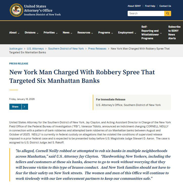 【美新社讯】1月16日,美国司法部(DOJ)发布公告披露:纽约男子科内尔·尼利(Cornell Neilly)不仅违反监督释放条件,而且被指控在曼哈顿抢劫六家银行。