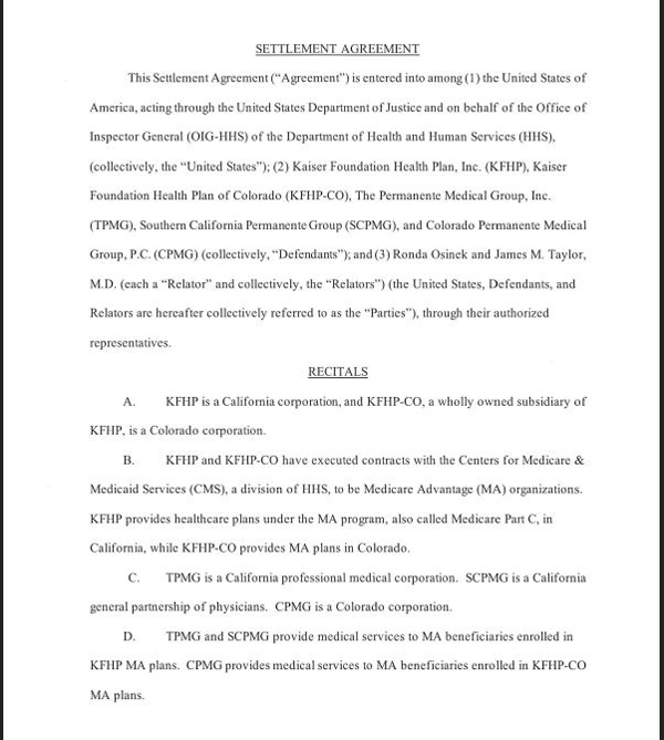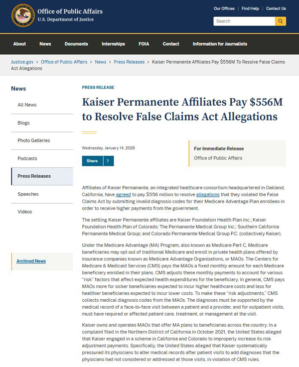關鍵詞: 美国司法部,DOJ, 凯撒医疗集团,Kaiser Permanente,违反《虚假申报法案》指控,和解