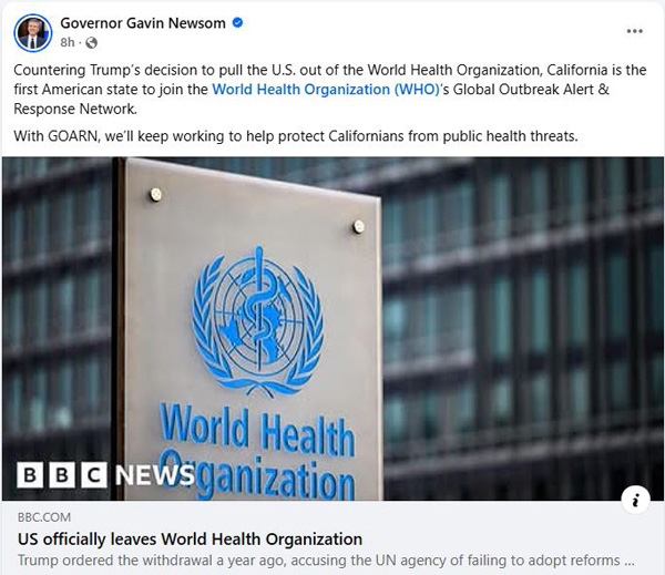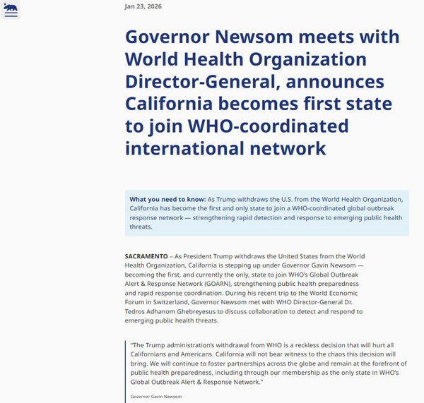 【美新社讯】1月23日,加州州长纽森(Gavin Newsom)办公室发布公告:在特朗普总统宣布美国退出世界卫生组织(WHO)之际,加州在州长纽森的领导下挺身而出,成为第一个也是目前唯一一个加入世卫组织全球疫情警报和应对网络(GOARN)的州,从而加强公共卫生准备和快速应对协调能力。