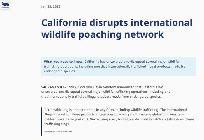 關鍵詞: 加州,加州州长,纽森,Gavin Newsom,加州渔业和野生动物部,CDFW,野生动物走私,国际野生动物走私网络,捣毁国际野生动物走私网络