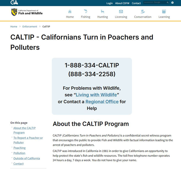 向 CalTIP 项目举报野生动物走私和盗猎活动(加州渔业和野生动物部(CDFW)图片)