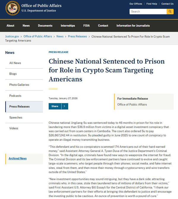 【美新社讯】1月27日,美国司法部(DOJ)公告披露:一名中国公民 Jingliang Su 被判处 46 个月监禁,罪名是参与洗钱,涉及从美国受害者手中骗取的超过 3690 万美元。