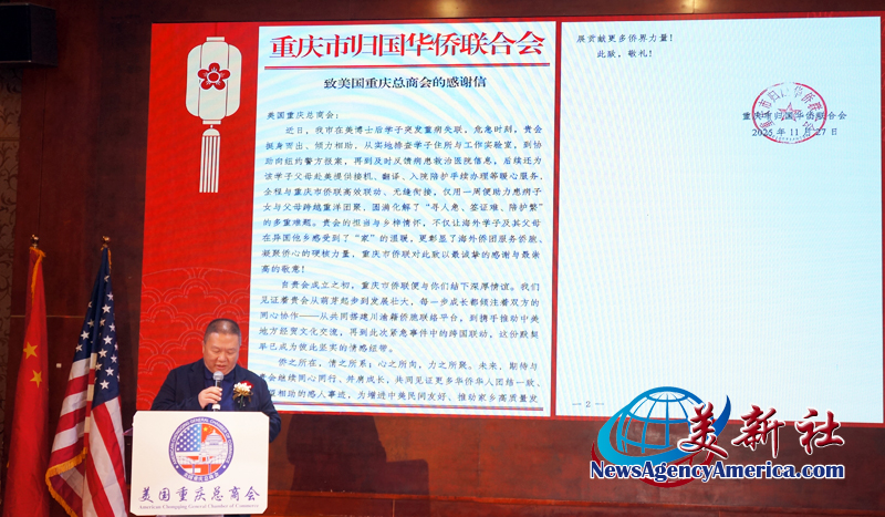 美国重庆总商会首席财务官 陈渝峰 宣读重庆市归国华侨联合会的感谢信