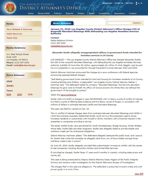 🛑 被告人亚历山大·苏弗(Alexander Soofer)(出生日期:1983年11月12日)在案件编号26CJCF00450中被控11项重罪,包括利益冲突、两项提供虚假证据的重罪和五项伪造罪,这些罪名与LAHSA和Abundant Blessings之间数百万美元的合同有关。