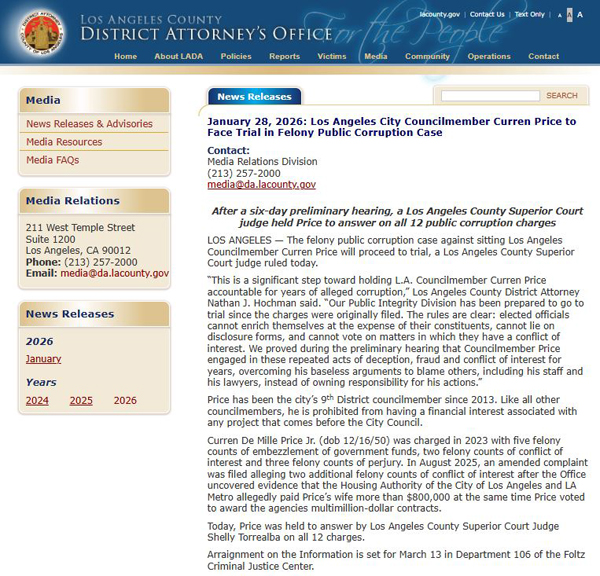【美新社讯】1月28日,洛杉矶郡地区检察长霍赫曼(Nathan Hochman)办公室发布公告:经过为期六天的预审听证会,洛杉矶郡高等法院法官裁定,洛杉矶市议员库伦·普莱斯(Curren Price)必须就全部12项公共腐败指控接受审判。