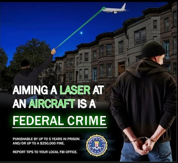 🚨 用激光束照射空中的飞机构成严重的飞行安全风险。激光束会导致飞行员迷失方向、暂时失明 -- 可能导致空中相撞或其他事故 -- 在某些情况下甚至会导致永久性视力损伤或失明。据美国联邦航空管理局(FAA)称,2025年,飞行员报告了10,993起激光照射事件。