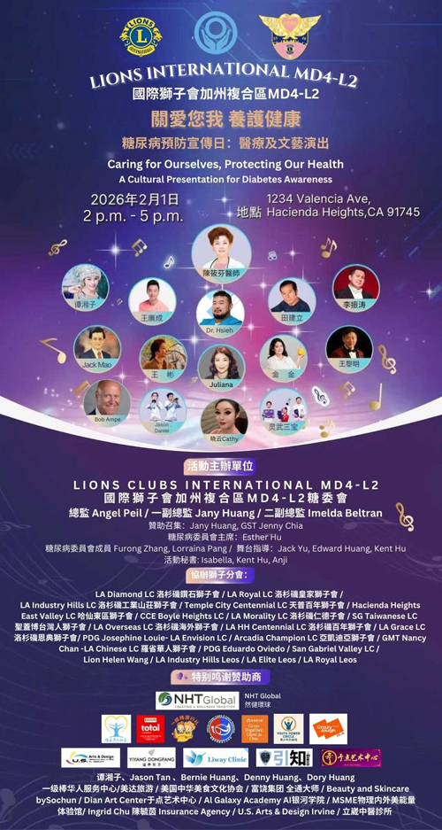 【洛杉磯訊】2月1日下午,適逢農曆新年前夕,國際獅子會 MD4–L2 區於 Hacienda Heights Community Center 隆重舉辦 2025–2026『照顧自己・守護健康』糖尿病預防公益宣傳活動。