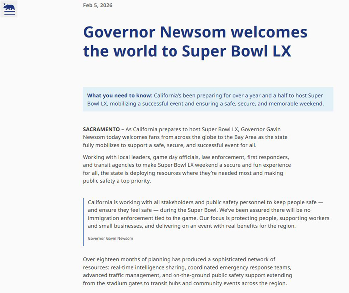 🔹 公共安全是加州的头等大事。加州正与地方官员、执法部门、急救人员、交通运输机构和社区领袖携手合作,共同保障超级碗期间的公共安全。