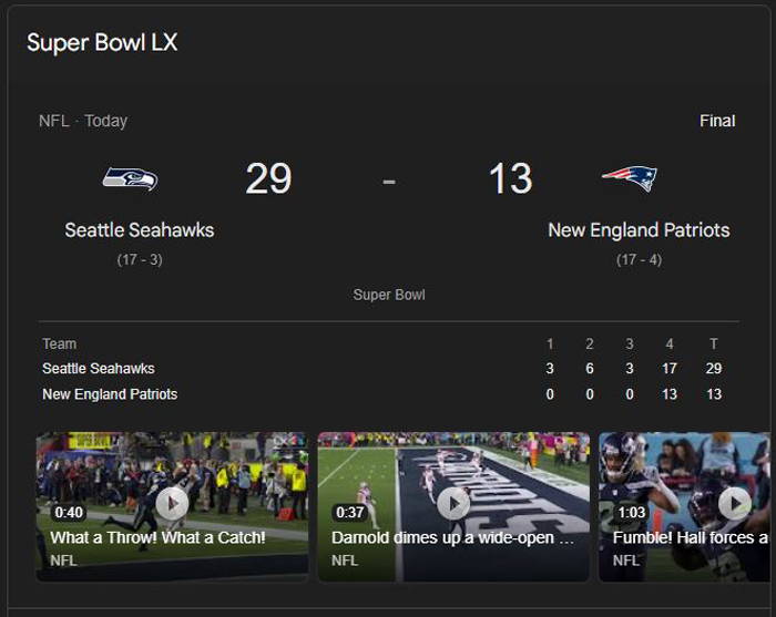 關鍵詞: 超级碗,第60届超级碗,Super Bowl, Super Bowl LX,西雅图海鹰队,新英格兰爱国者,29比13,西雅图海鹰队击败新英格兰爱国者,西雅图海鹰队夺冠