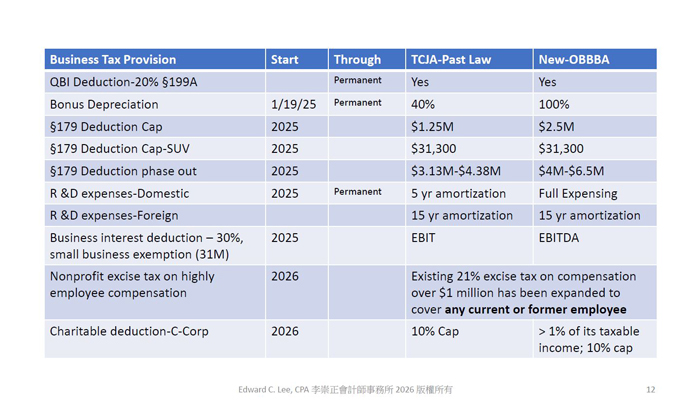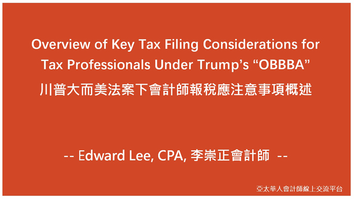 由資深會計師李崇正 Edward Lee, CPA 主講,針對『One Big Beautiful Bill』法案帶來的全方位變革進行剖析,內容包括: