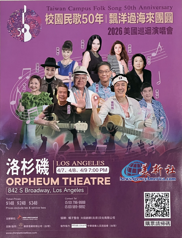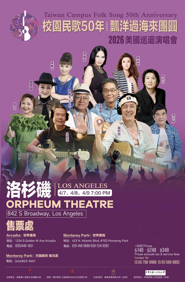 【美新社洛杉磯訊】台灣校園民歌 50 年『飄洋過海來團圓』2026 美國巡迴演唱會即將隆重登陸北美,4月7日-9日將於洛杉磯 Orpheum Theatre 連演三場。