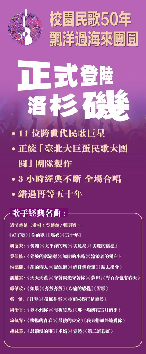 關鍵詞: 台灣校園民歌50年『飄洋過海來團圓』2026美國巡迴演唱會,台灣校園民歌,飄洋過海來團圓,美國華人票房文化傳播公司,戴錡