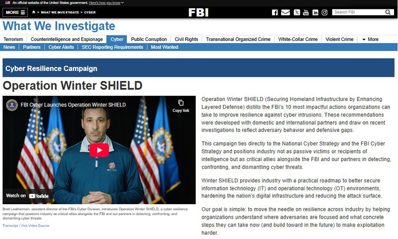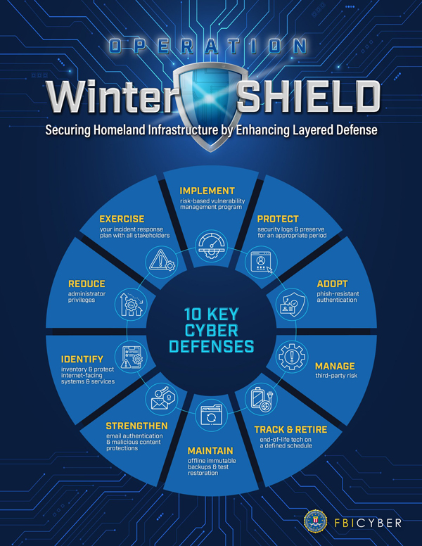 『冬季盾牌』行动 ,通过增强分层防御来保护国土基础设施,提炼了 FBI 提出的 10 项最具影响力的行动,旨在帮助组织提高抵御网络入侵的能力。这些建议由国内外合作伙伴共同制定,并借鉴了近期调查结果,旨在反映敌对势力的行为和防御漏洞。
