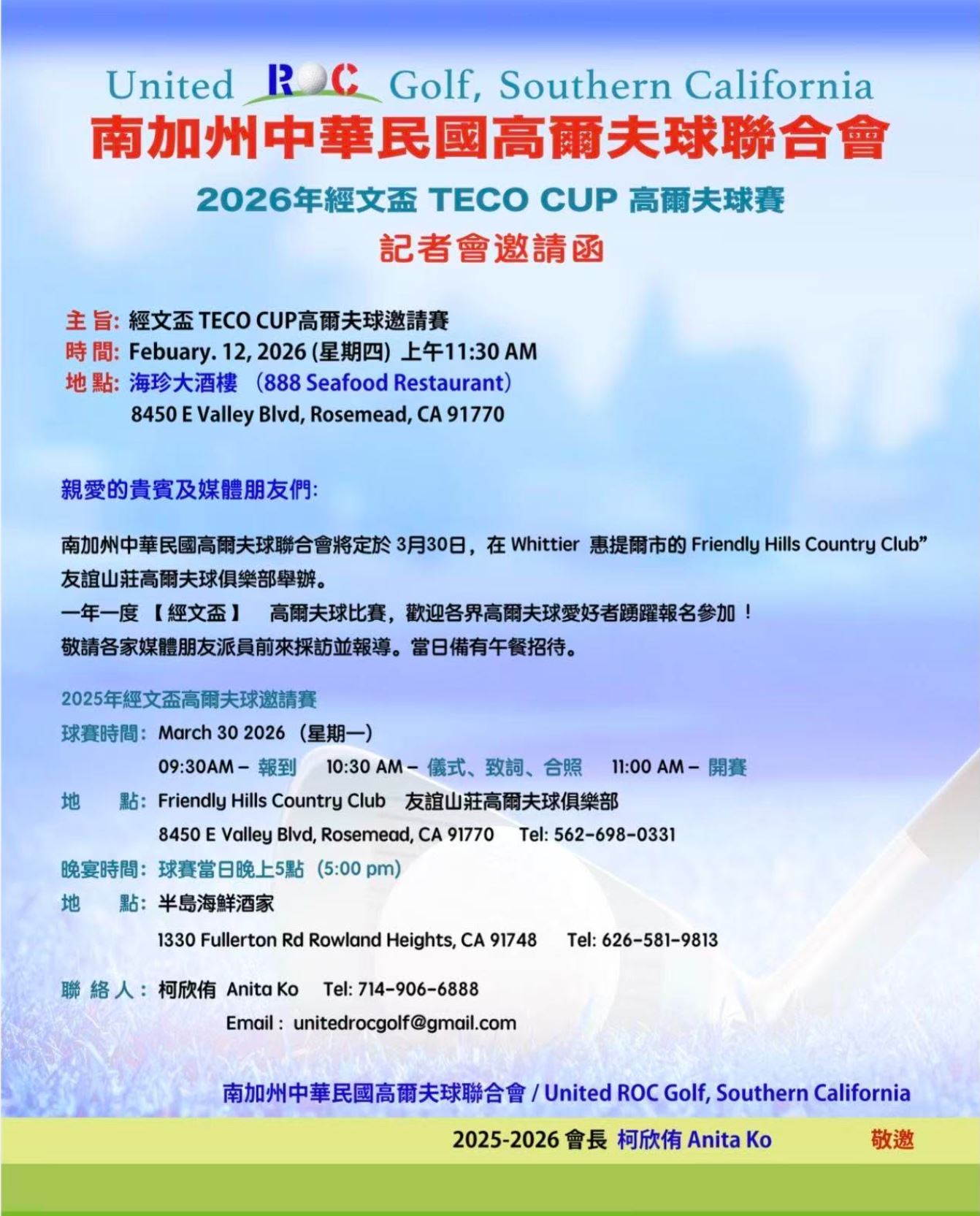 2026年2月12日,南加州中華民國高爾夫球聯合會於羅斯密市海珍大酒樓舉行記者會,正式宣布第30屆「經文盃」高爾夫球賽將於3月30日(星期一)在惠堤爾市 Friendly Hills Country Club 盛大舉行。