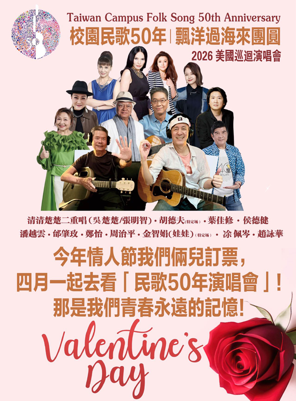 關鍵詞: 台灣校園民歌50年『飄洋過海來團圓』2026美國巡迴演唱會,台灣校園民歌,飄洋過海來團圓,美國華人票房文化傳播公司,戴錡