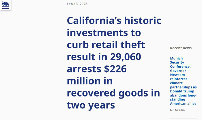 【美新社讯】2月13日,加州州长纽森(Gavin Newsom)办公室发布公告:得益于加州政府的投资以及州长纽森持续打击犯罪活动的决心,地方执法机构在两年内逮捕了 29,060 名嫌疑人,并将近 22,896 起与有组织零售盗窃相关的案件移交检控部门,追回了价值 2.26 亿美元的赃物。从2023年10月到2025年9月,在州政府历史性拨款的支持下,执法机构有效提升了公共安全,并严厉打击了有组织零售盗窃。