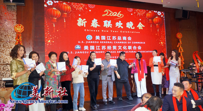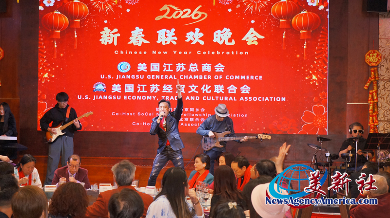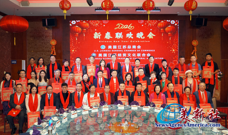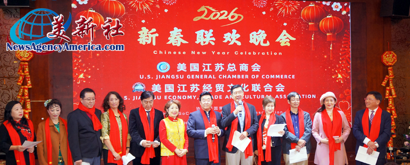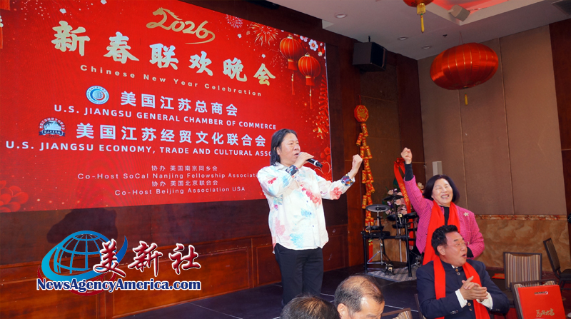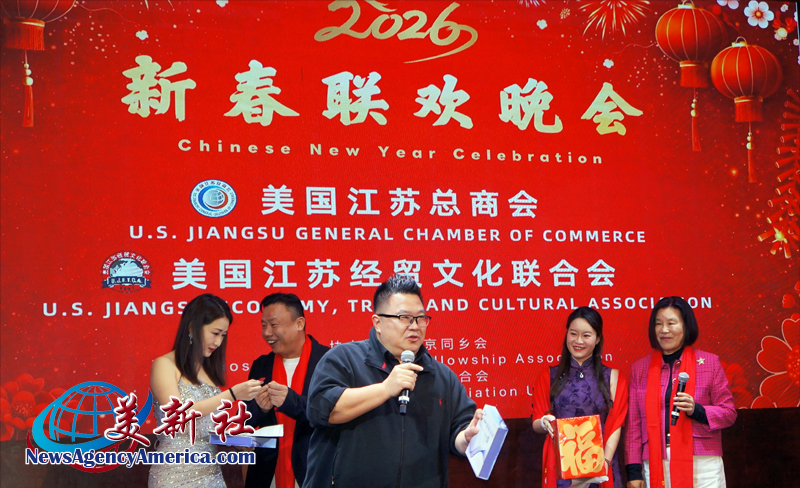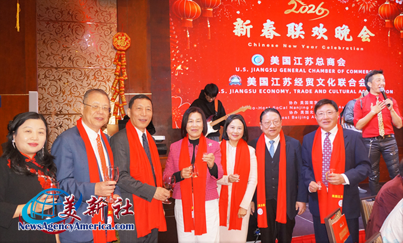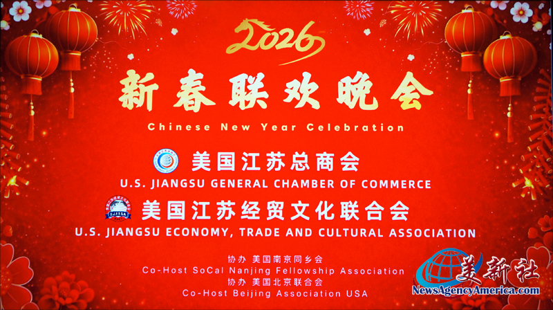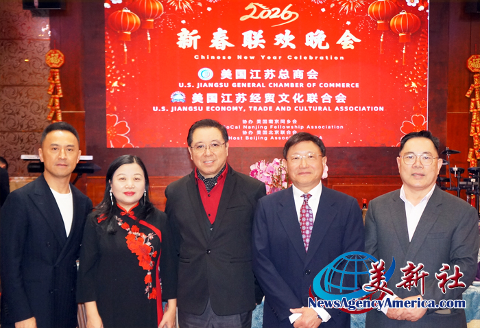 【美新社洛杉矶讯】2025年2月12日晚间,美国江苏总商会与美国江苏经贸文化联合会(以下简称江苏两会)于洛杉矶罗兰岗凯悦华达大酒店,隆重2026年新春联欢晚会。美国南京同乡会和美国北京联合会协办此次新春联欢晚会。