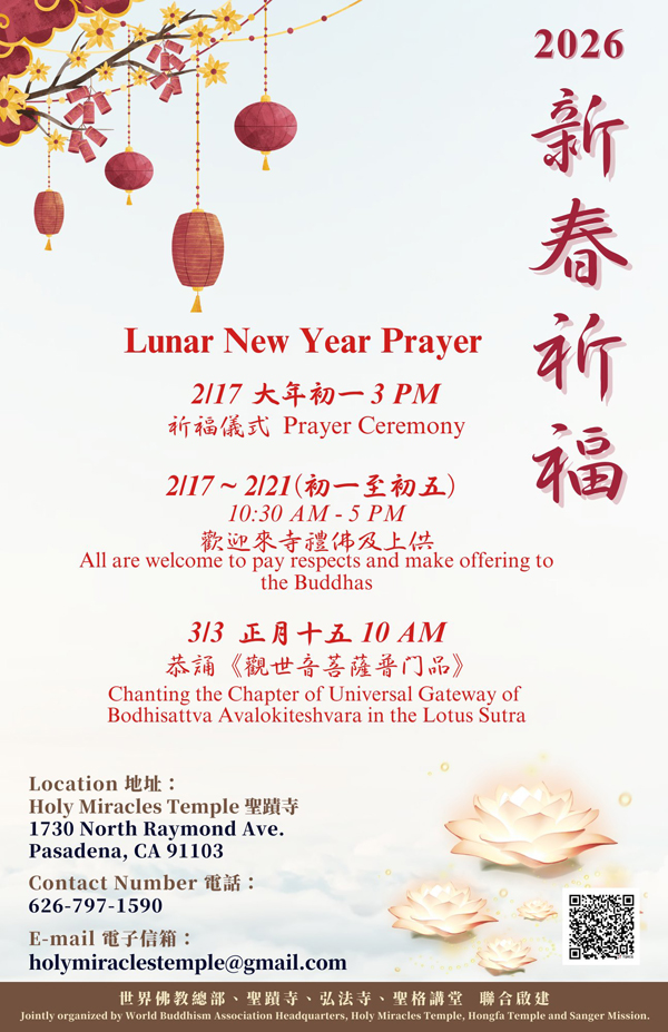 【洛杉磯訊】為迎接2026年農曆新春,世界佛教總部聯合聖蹟寺、弘法寺及聖格講堂,共同舉辦『2026全球新春祈福系列活動』,以誦經祈福、供燈、供花、禮佛等法會儀軌,為信眾揭開新歲序幕。主辦單位表示,活動秉持世界佛教教皇第三世多杰羌佛所倡導『承擔眾生所有痛苦罪業,迴向眾生所有幸福利益』的行願精神,期盼在新的一年引領大眾自覺覺他,促進社會祥和與世界和平。