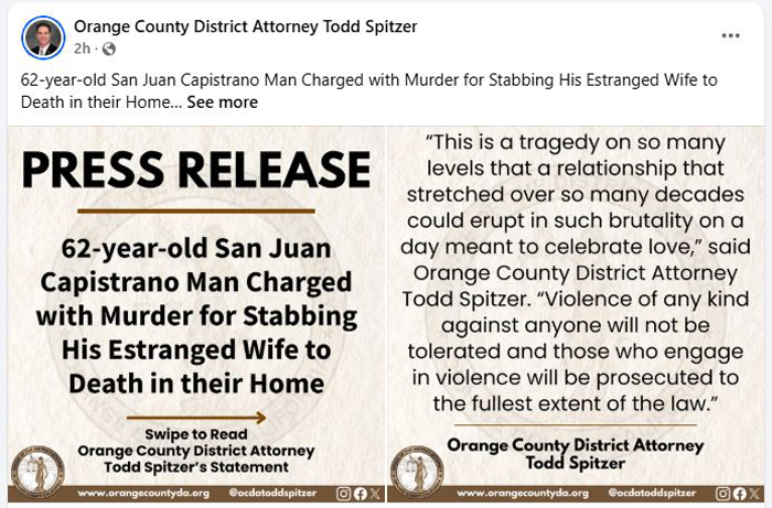 “这是一场多层次的悲剧,一段持续数十年的感情竟然在这样一个本应庆祝爱情的日子里以如此残暴的方式爆发,”橙郡地区检察长托德·斯皮策(Todd Spitzer)说道。“任何形式的暴力行为都绝不容忍,任何施暴者都将受到法律的严惩。”