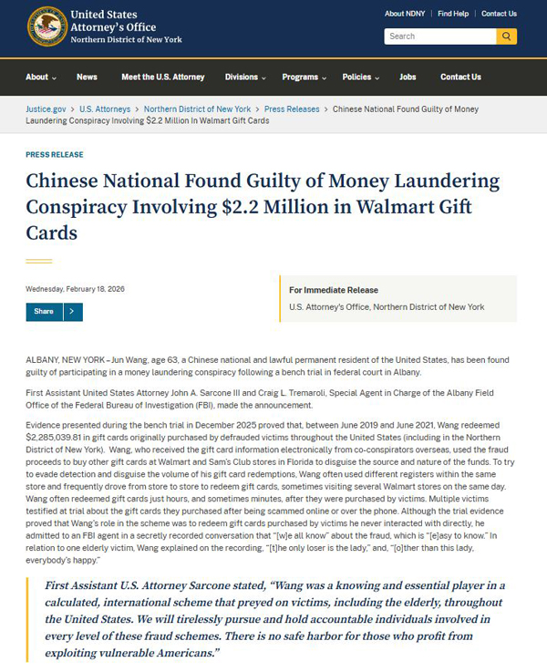 【美新社讯】近日,美国司法部(DOJ)发布公告披露:现年63岁的中国公民、美国合法绿卡居民 Jun Wang 在奥尔巴尼联邦法院的非陪审团审判后,被判犯有参与洗钱阴谋罪。其涉案金额达220万美元,涉及沃尔玛礼品卡。