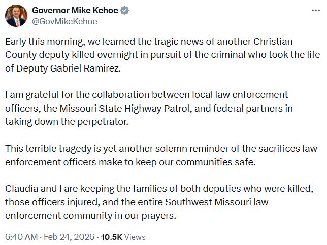 我和妻子克劳迪娅将为两位殉职警员的家属、所有受伤的警员以及整个密苏里州西南部的执法人员祈祷。”