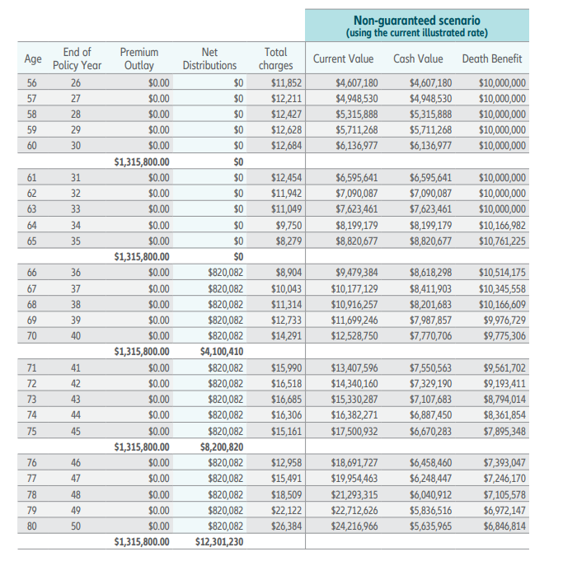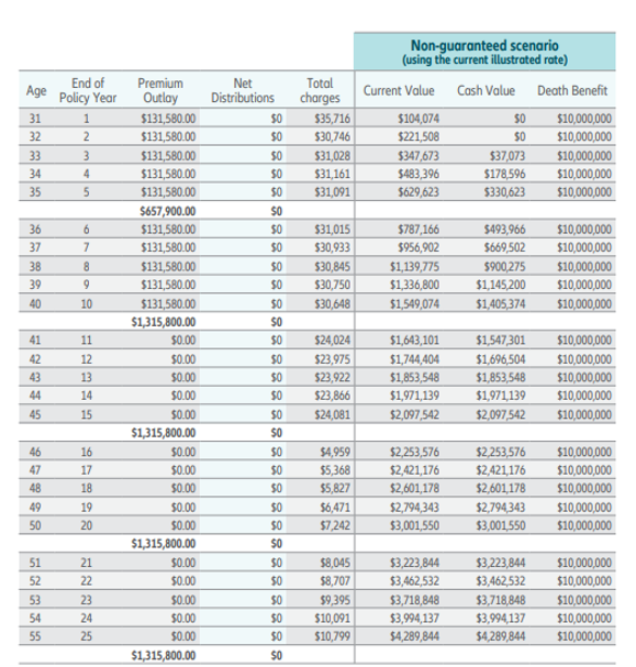 30岁女性,每年存13.1万美元存10年。由于人寿保险高杠杆的特点可以得到较高的身故理赔(1,000 万美金)。