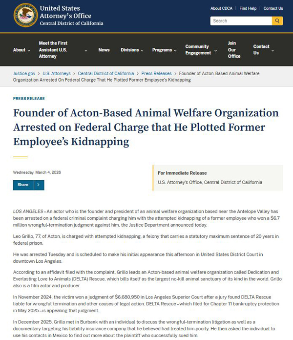 🚨 根据法院文件,被告人格里洛领导着一家位于阿克顿的动物福利组织,名为“奉献与永恒之爱动物救援组织”(Dedication and Everlasting Love to Animals,简称 DELTA Rescue)。该组织自称是世界上最大的同类“不杀生”动物保护区。被告人格里洛同时也是一名电影演员和制片人。