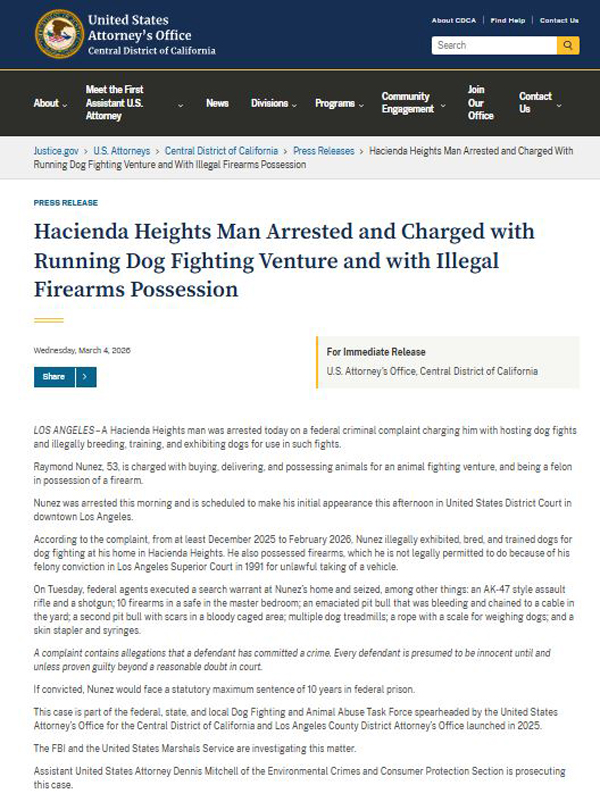 🚨 根据刑事指控书显示,至少从2025年12月至2026年2月期间,被告人努涅斯在其位于哈仙达岗的住所内,非法展示、繁育并训练犬只用于斗狗活动。此外,他还持有枪支;鉴于他曾在1991年因“非法盗取车辆”而在洛杉矶高等法院被判处重罪,法律禁止他持有此类武器。