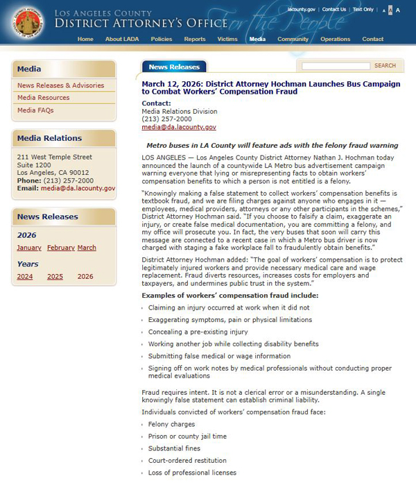 【美新社讯】2026年3月12日,洛杉矶郡地区检察长(LADA)霍赫曼(Nathan J. Hochman)办公室发布公告:正式在全洛杉矶郡范围内发起一项洛杉矶大都会公交(LA Metro)广告宣传活动。该活动旨在向公众发出警告:通过撒谎或歪曲事实来骗取其无权享有的工伤赔偿福利,属于重罪行为。
