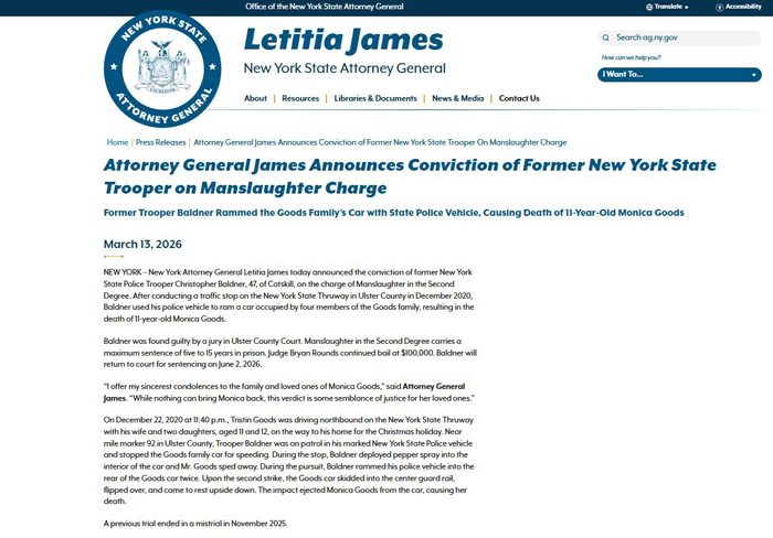 【美新社讯】3月13日周五,纽约州司法部长/总检察长莱蒂西亚·詹姆斯(Letitia James)宣布,来自卡茨基尔(Catskill)的47岁前纽约州警克里斯托弗·巴尔德纳(Christopher Baldner)因二级过失杀人罪被定罪。