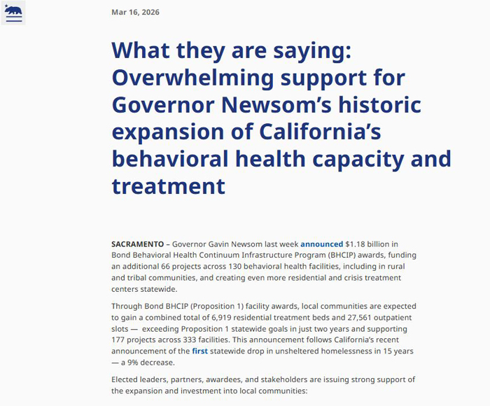 通过“债券BHCIP”(即“第1号提案”)提供的设施拨款,预计各地社区将新增共计6,919张住宿式治疗床位和27,561个门诊服务名额。这一成果仅用两年时间便超越了“第1号提案”所设定的全州目标,并为分布在333家机构的177个项目提供了有力支持。在此次宣布之前,加州刚刚发布了一项重要数据:全加州范围内“无遮蔽流浪者”(即露宿街头者)的人数在15年来首次出现下降 -- 降幅达9%。