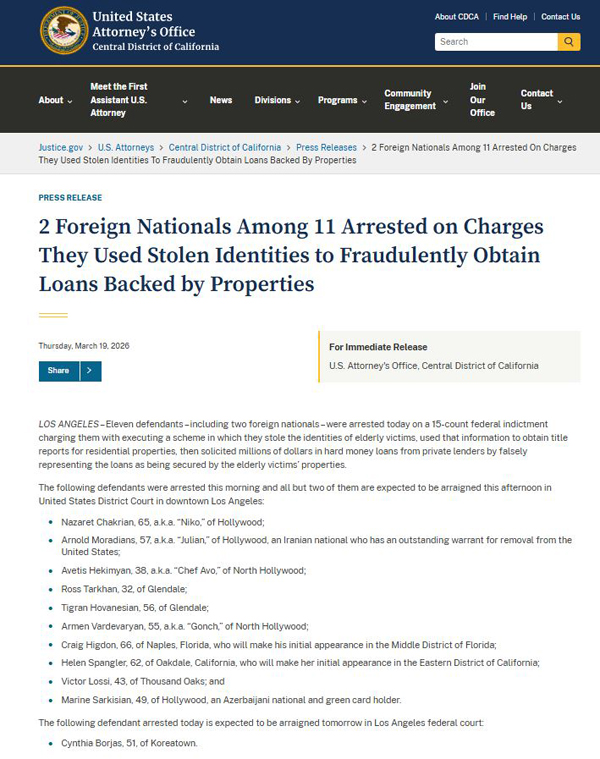 【美新社讯】3月19日,美国司法部(DOJ)公告披露:11名被告(其中包括两名外籍人士)依据一份包含15项指控的联邦起诉书被捕。起诉书指控他们策划并实施了一项欺诈方案:盗用老年受害者的身份信息,利用这些信息获取住宅房产的产权报告,随后向私人放贷机构虚假宣称这些贷款由老年受害者的房产作为抵押担保,从而骗取了数百万美元的“硬钱贷款”(Hard money loans)。