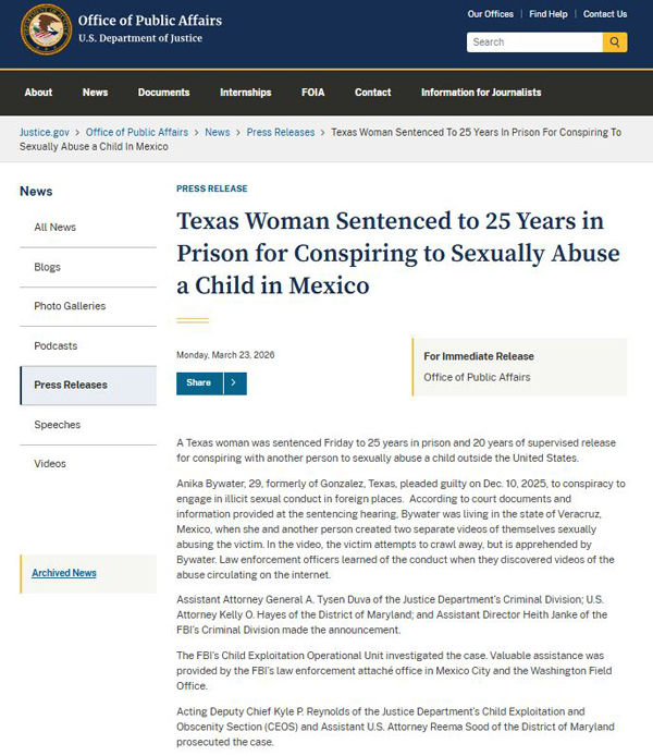 【美新社讯】3月23日,美国司法部(DOJ)公告披露:德克萨斯州一名女子因与他人密谋在美国境外性侵一名儿童,被判处25年监禁,刑满后还需接受20年的监管释放。