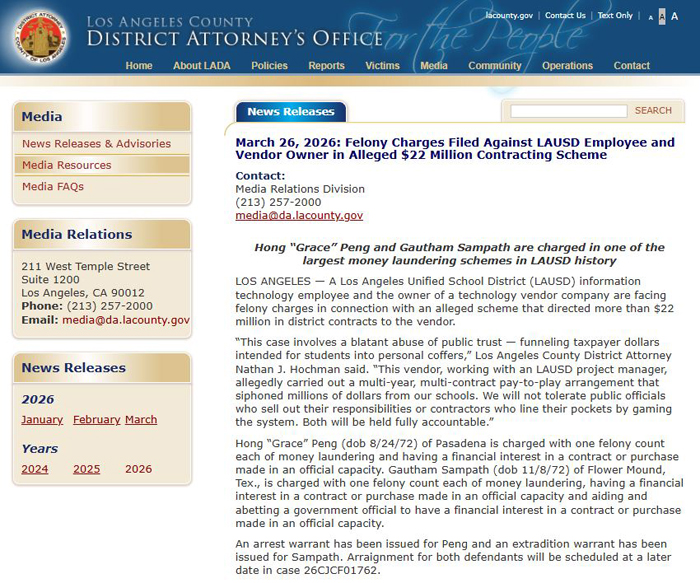 【美新社讯】2026年3月26日,洛杉矶郡地区检察长(LADA)霍赫曼(Nathan J. Hochman)办公室发布公告:洛杉矶联合学区(LAUSD)的一名信息技术员工与一家科技供应商公司的业主正面临重罪指控,罪名涉及一项涉嫌将学区超过 2200 万美元的合同非法输送给该供应商的舞弊计划,这也可能是洛杉矶联合学区历史上规模最大的洗钱案件之一。