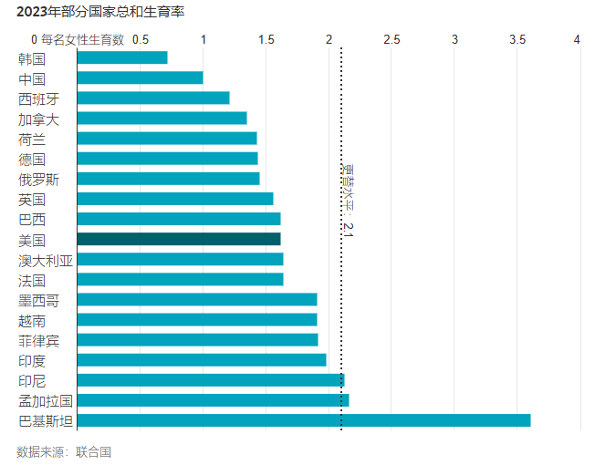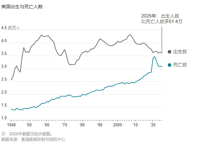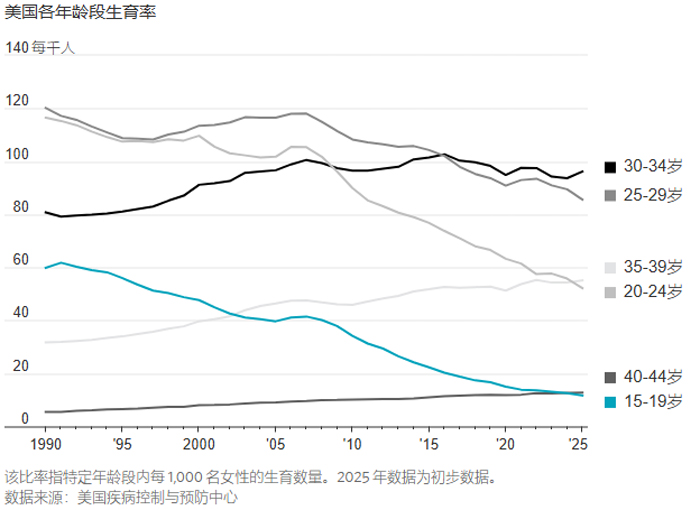 根据美国疾病控制与预防中心最新发布的初步数据,2025 年美国一般生育率降至 53.1,创下历史新低;全年出生人口约 360.64 万,较 2024 年下降约 1%,并已连续第六年维持在约 360 万的水平。与此同时,美国总和生育率约为 1.57,明显低于维持人口自然更替所需的 2.1。从年龄结构来看,15 至 19 岁青少年的生育率继续下降,而 30 岁以上女性在整体生育中的占比持续上升,30 至 34 岁女性早已成为更重要的生育主力。